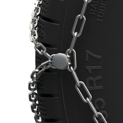 König XG Cross features a ground-up fitting system: thanks to the flexible cable sliding on the ground behind the wheel , all the chain parts get connected without moving the vehicle. Once the snow chain is mounted on the wheel, it does not require any additional stop for re-tensioning. In fact, thanks to the König ATC, the optimal tensioning and centering of the chain on the tyre is reached automatically while driving.